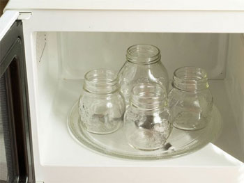 Чистые баночки заполняем водой на 1/3 емкости. Ставим банки (без крышек!) в микроволновку на 5 минут (на максимальную мощность). Затем воду сливаем и наполняем вареньем, икрой и т. д.
