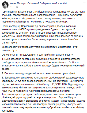 "Итак, сегодня в Верховной Раде зарегистрировали доработанный законопроект №6607 о введении Единого реестра лиц осужденных за преступления против половой свободы и неприкосновенности малолетней или малолетнего и усиление ответственности за преступления, совершенные против половой свободы и неприкосновенности малолетней или малолетнего", - пишет Анна Маляр.