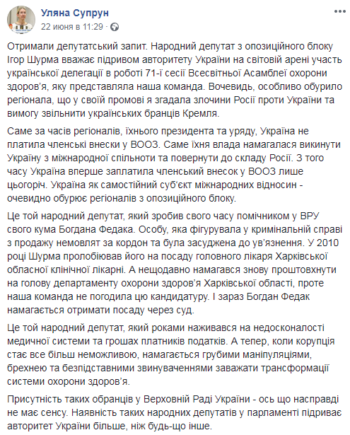 Так, нардеп заявил, что участием в работе 71 сессии Всемирной ассамблеи здравоохранения в Женеве в период с 21 по 25 мая 2018 года Ульяна Супрун и ее команда подрывают международный авторитет страны.