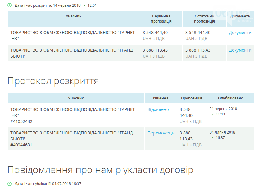 Более выгодную цену - 3,54 млн против 3,88 млн предложил одесский "Гарнет Инк". Однако его предложение было отклонено. (Известно, что предприятие фигурирует в производстве по признакам уголовного правонарушения по признакам ст 191 УК Украины (Привласнення, розтрата майна або заволодіння ним шляхом зловживання службовим становищем), но с чем связано отклонение предложения, неизвестно).