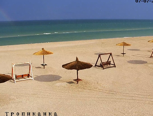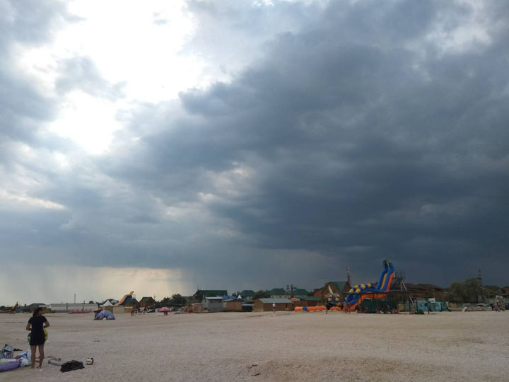 Отдыхающие в спешном порядке покинули пляжи и поспешили в укрытия. Впрочем, общанный синоптиками шквальный ветер утих вместе с коротким ливнем. А со стороны Федотовой косы на вебкамерах над морем отчетливо видна радуга.