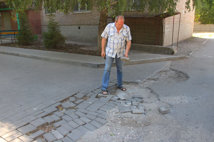 В редакцию после неудачных попыток обращения в управление ЖКХ пожаловался житель дома Виктор Максимов. По его словам, двор дома был выложен плиткой в 2015 г. И если с одной стороны двора плитку закрепили бордюром, то с другой этого сделано не было. Со временем плиточная кладка в этом месте начала разрушаться.