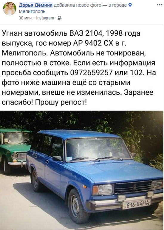 Мужчина сообщил, что у него угнали ВАЗ 2104 1998 года выпуска, синего цвета, номер АР 9402 СХ. Он просит всех, кто видел данное авто, обратиться по номеру телефона 097 265 92 57 (Павел) или 102.