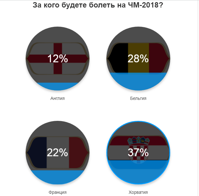 Сайт "Сегодня" провел опрос, в котором определена команда, за которую будет болеть большинство украинцев. 37% будут поддерживать сборную Хорватии. Это соотношение на протяжении всего дня голосования остается неизменным.
