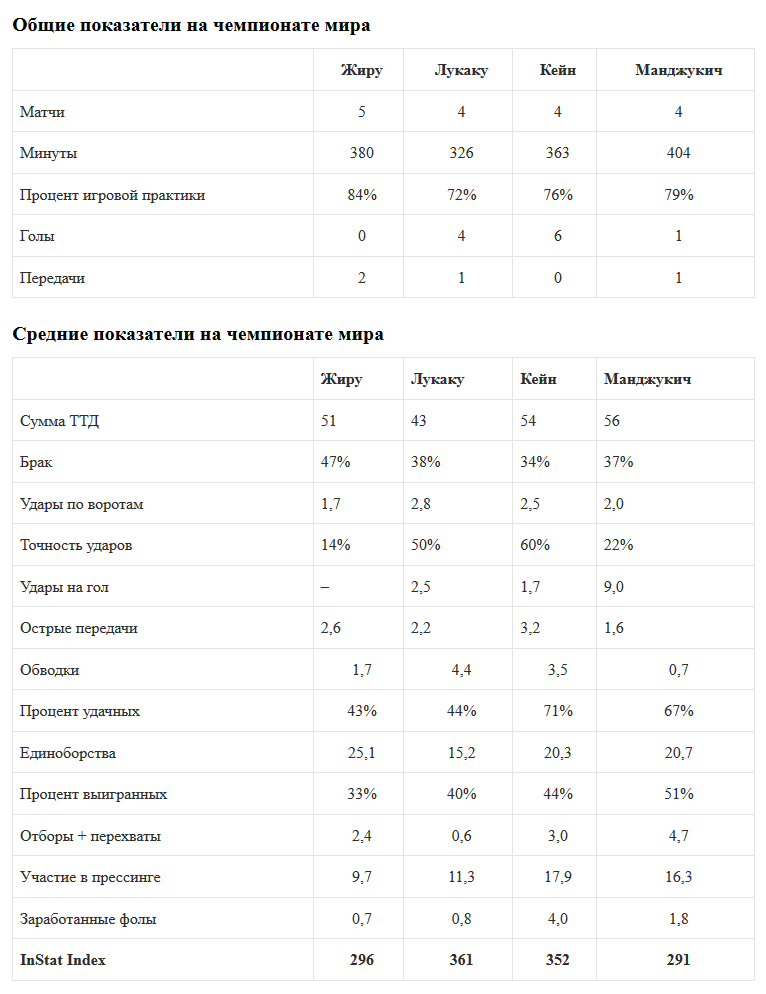 Даже не дожидаясь окончания турнира, можно смело говорить о том, что этот чемпионат мира проходит под знаком эффективной игры мощных центральных форвардов, умеющих цепляться за мяч. При развитии быстрых атак, а их стремятся проводить все участники полуфиналов, это очень важное качество. Мы рассмотрели выступления нападающих сборных Франции, Бельгии, Англии и Хорватии.