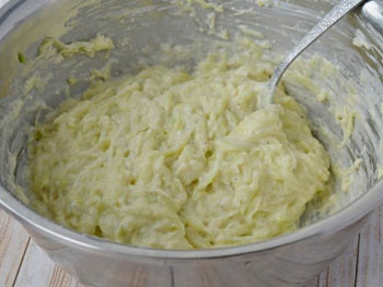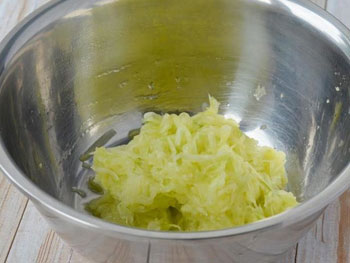 1. Кабачки очистить от шкурки и натереть на крупной терке, посолить, дать постоять 10 мин. Слить выделившейся сок, хорошо отжать.