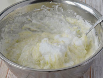 2. В кабачковую массу добавить желтки, сметану, муку с разрыхлителем, поперчить, если нужно досолить.