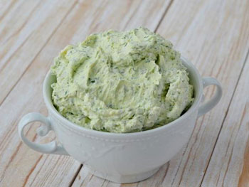 7. Пока остывает кабачковый корж приготовить начинку. Творожный сыр смешать с любой мелкорубленой зеленью, мелкорубленым чесноком, все пробить блендером. Если сыр не соленый, посолить по вкусу.