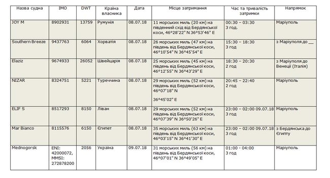 Суда задерживали на расстоянии от 20 до 56 километров от Бердянской косы на время от 2 до 3 часов. Клименко приводит таблицу:
