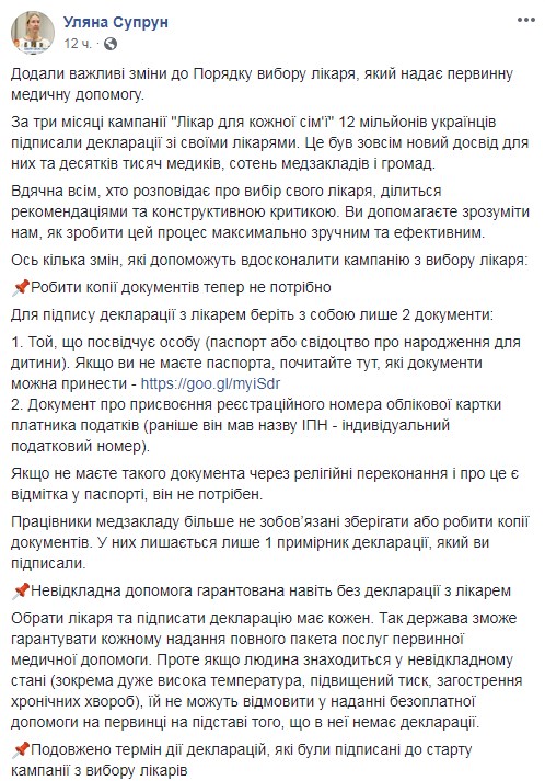 За три месяца кампании "Врач для каждой семьи" декларации подписали 12 миллионов украинцев. Для удобства подписания документа введен ряд изменений. Об этом написала и.о. министра здравоохранения Ульяна Супрун в Facebook.