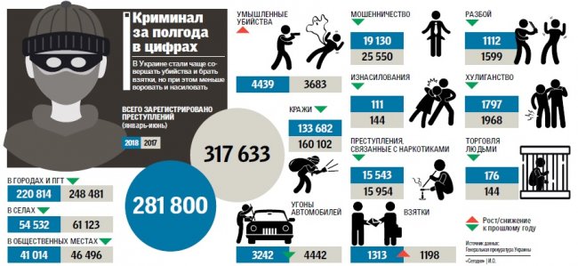 В Украине снизился общий уровень преступности, но увеличилось число особо тяжких преступлений, совершенных с особой жестокостью, цинизмом или в особо крупных размерах, за которые предусмотрено наказание от 10 лет тюрьмы до пожизненного. Такую статистику за первое полугодие 2018 года обнародовала Генеральная прокуратура (см. инфографику).