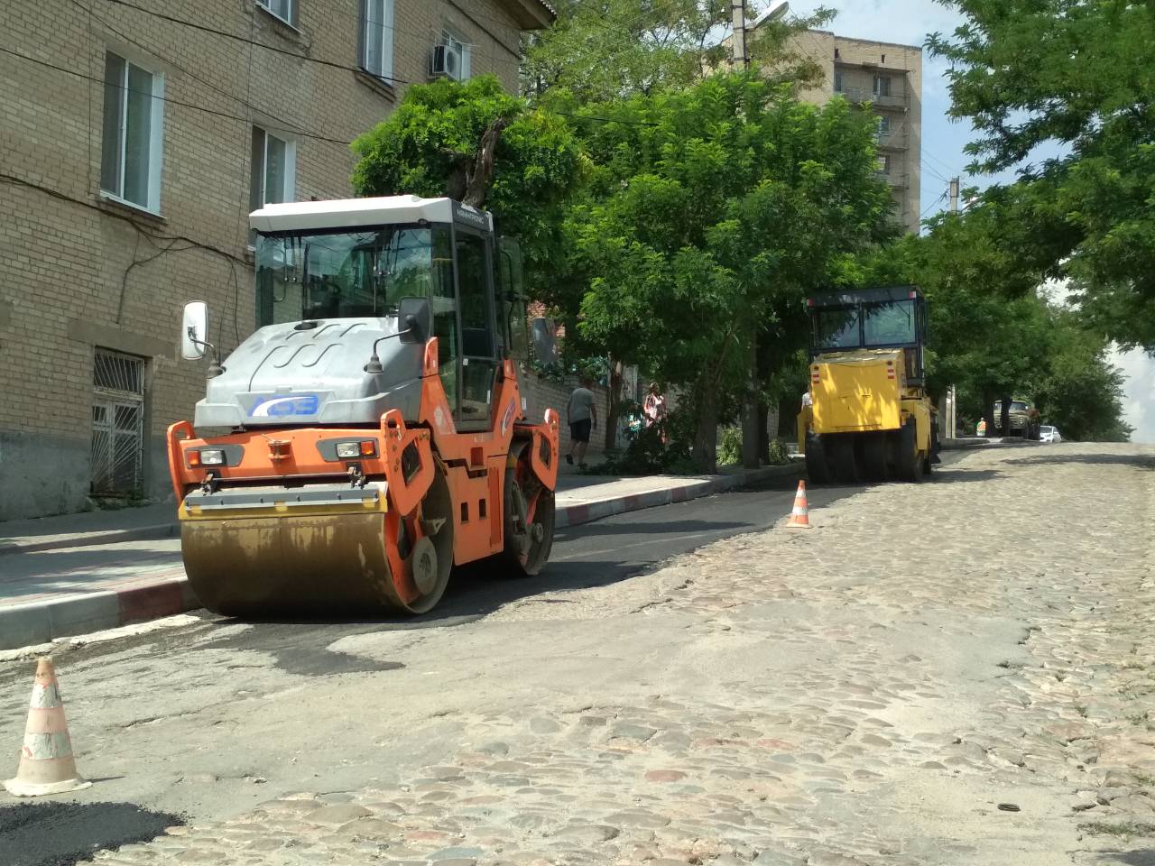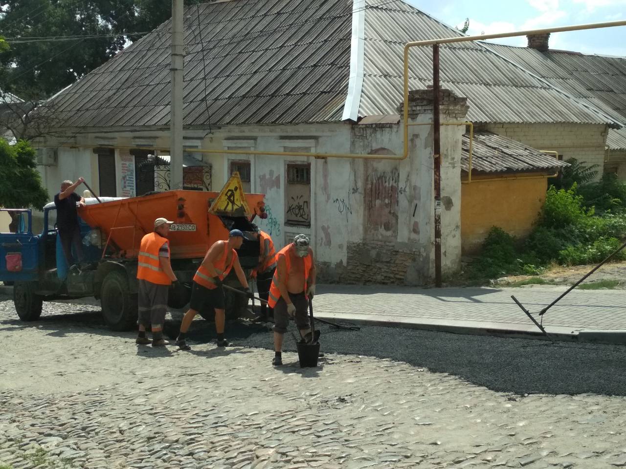 В центре города в асфальт закатывают старую брусчатку