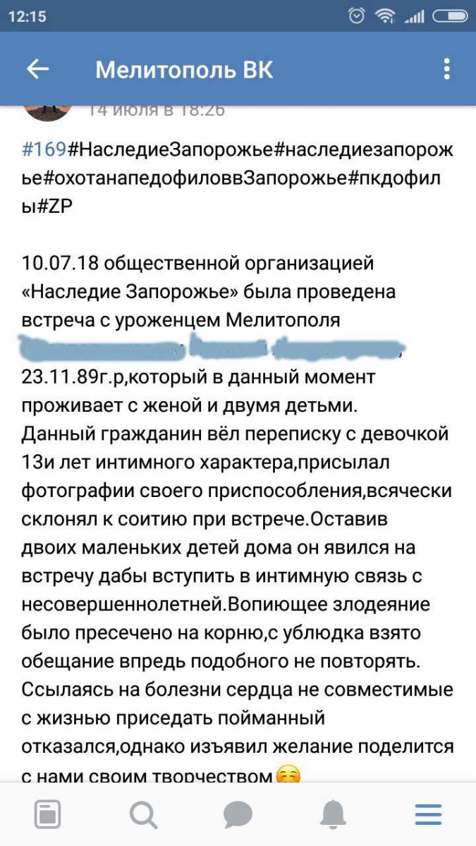 Общественная организация «Наследие Запорожье» опубликовала в соцсетях информацию о педофиле из Мелитополя. По данным общественников, у 29-летнего мужчины есть жена и двое детей, но интересовался он больше несовершеннолетними. Он вел переписку с 13-летней девочкой, предлагая ей вступить в интимную связь. Даже о встрече договорились,только вместо девочки пришли на нее активисты.