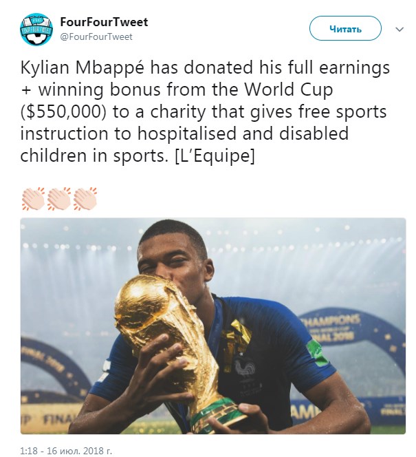 Нападающий сборной Франции Килиан Мбаппе, признанный лучшим молодым футболистом Чемпионата мира-2018, отказался от денег, заработанных в составе национальной команды на турнире. Он передал их на благотворительность. Об этом сообщается в Twitter-аккаунте FourFourTweet.