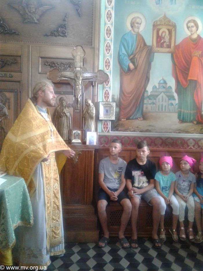 После Божественной литургии у юных паломников началась познавательная экскурсия по храму, которую проводил отец. По словам батюшки, Троицкая церковь берет свое начало в далеком 1813 году. Расположена она на территории с. Обиточное. Изначально церковь была возведена из дерева, но в 1836 году ее построили уже из камня. В росписи храма принимали участия мастера, которых приглашали со всех уголков Российской империи. Роспись - из двенадцати фресок, восемь из которых восстановлены в наше время благодаря небезразличным художникам.