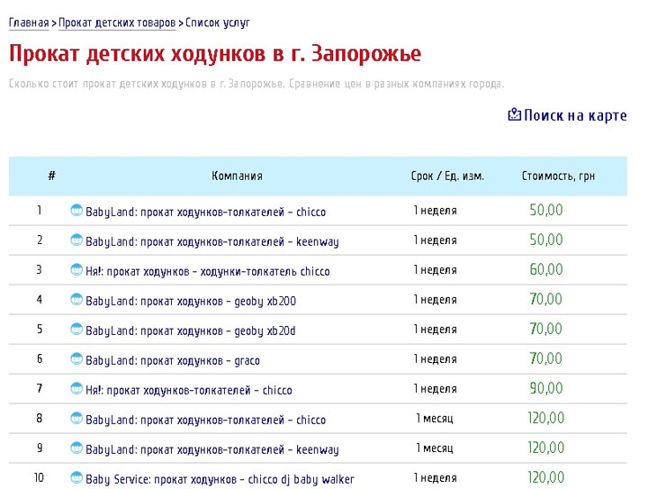 С помощью этого сервиса мы нашли 3 пункта проката детских ходунков в городе. Исследования показывают, стоимость услуги зависит от срока и модели ходунков. Рассмотрим средние, минимальные и максимальные цены на прокат этого детского товара.