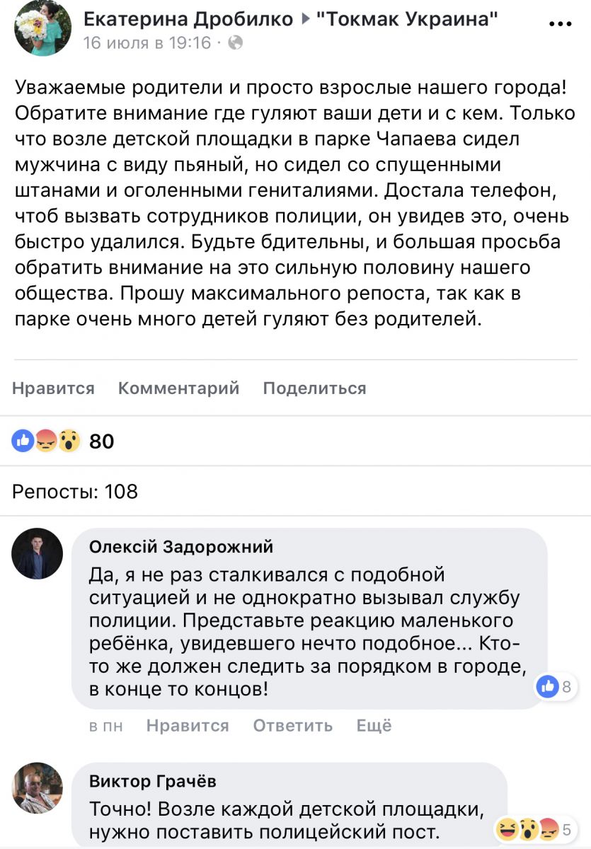 Проходя мимо детской площадки в парке Чапева, в родном городе Токмак, девушка стала свидетелем неоднозначной картины. На скамейке сидел мужчина со спущенными штанами и оголенными половыми органами. По словам невольной свидетельницы, увидев её мужчина резко удалился.