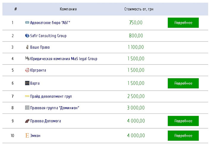 Рассмотрим более подробно 7 лучших (с точки зрения стоимости) услуг юристов:
