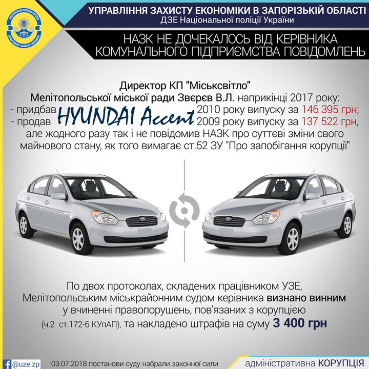 Как сообщают в Управлении защиты экономики, в конце прошлого года В. Зверев купил HYUNDAI Accent 2010 года выпуска за 146395 грн. и продал старый HYUNDAI Accent 2009 года выпуска за 137522 грн. При этом директор коммунального предприятия не сообщил НАПК о существенных изменениях имущественного положения.