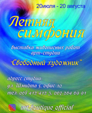 В окнах-витринах читального зала на пл. Победы выставлены более 50 живописных работ членов арт-студии "Свободный художник". На них – лето, море, цветы, животные – все, что дарит радостное настроение и способствует жизнелюбию. Здесь же есть портреты авторов и короткие рассказы о них, пожелания художников своим зрителям. Самой младшей художнице девять лет, а самой опытной – 62 года. В течение месяца, семь дней в неделю и 24 часа в сутки любой горожанин может посмотреть "Летнюю симфонию" от "Свободных художников". Кроме эстетического наслаждения, можно и приобрести понравившуюся живописную работу, созвонившись с художником. Контакты указаны на рекламном плакате.