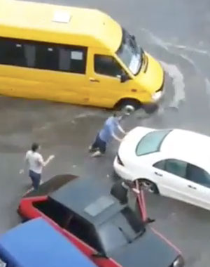 Уровень воды на проезжей части поднялся на столько, что вода заливает двигатели автомобилей. Машины глохнут.