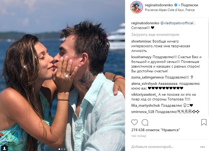 О радостном событии украинская певица и телеведущая сообщила на своей странице в Instagram. Регина опубликовала серии снимков на которых отчетливо видно кольцо с крупным драгоценным камнем, и подписала снимок так: «Влад Топалов, согласна!».