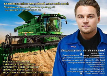 Известный голливудский актер теперь рекламирует одно из украинских учебных заведений - Леонардо Ди Каприо стал лицом рекламной кампании Куликовского профессионального аграрного лицея в Черниговской области.