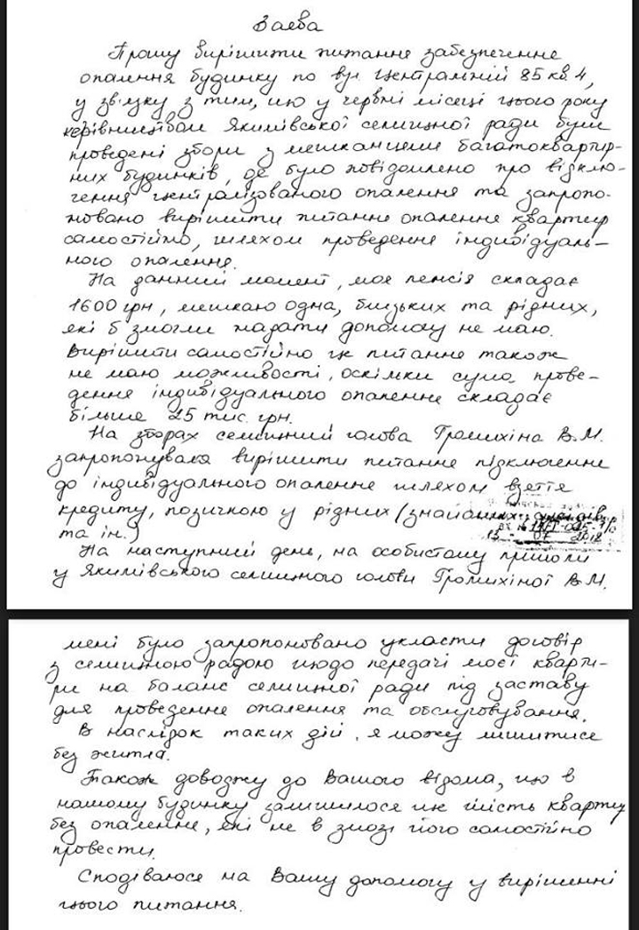 16 июля в социальной сети на странице «Акимовской Правды» был размещен пост о том, что глава Акимовской ОТГ Валентина Громыхина предложила жительнице Акимовки заключить договор о передаче квартиры на баланс поселкового совета под залог проведения индивидуального отопления и обслуживания.