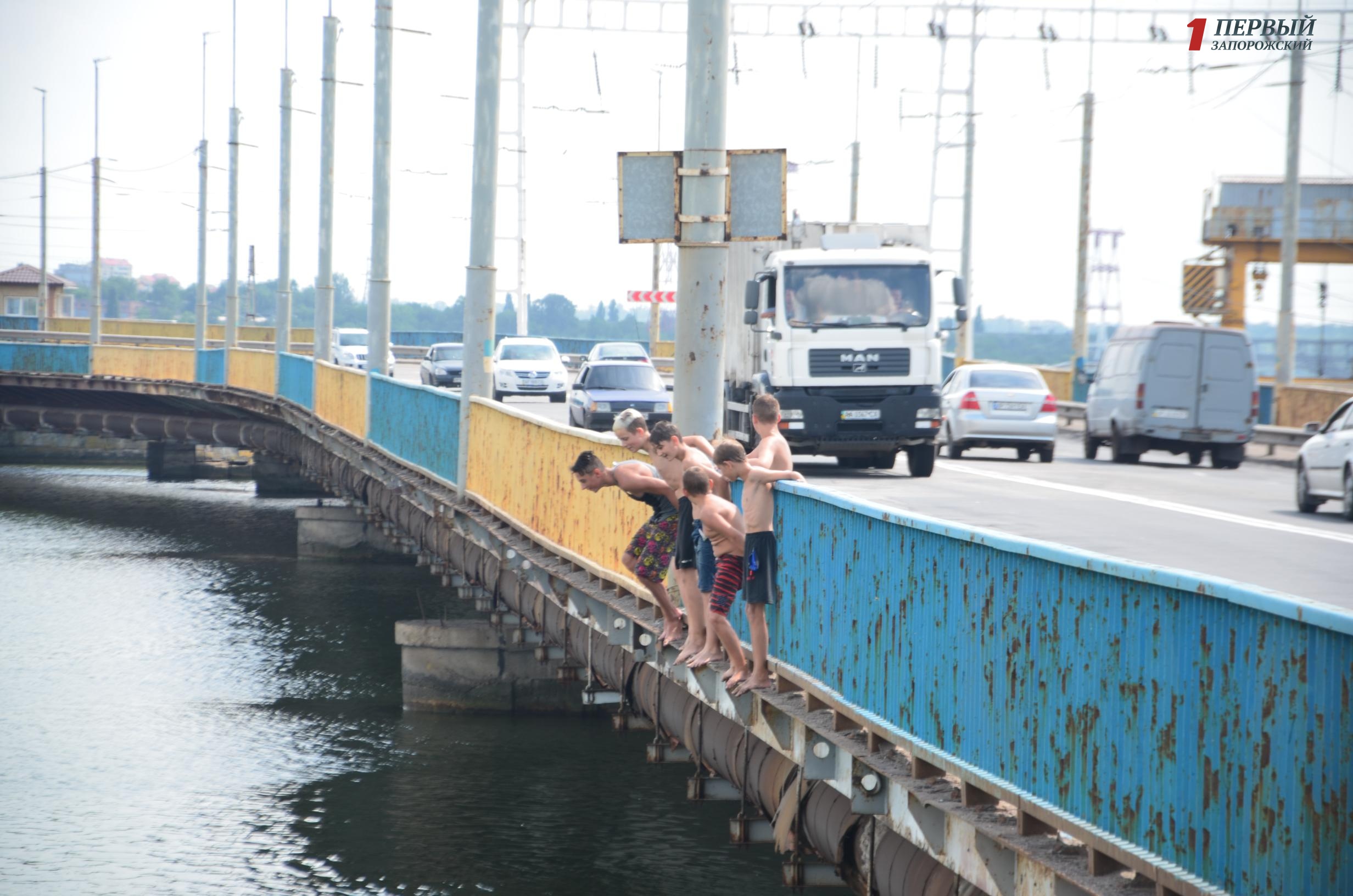 Дети прыгают с моста ДнепроГЭСа, несмотря на то, что там купаться запрещено. Однако, очевидно, юные смельчаки считают, что этот запрет их не касается.