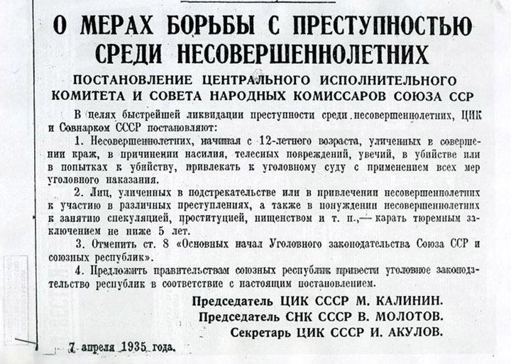 С 7 апреля 1935 года было приянто постановление номер 3/598, по которому к высшей мере наказания по статьям советского УК могло применяться с возраста в 12 лет, постановление подписал лично Сталин — это происходило как раз в те годы, когда советская пропаганда изображала Сталина как "друга детей" с девочкой на руках и в окружении пионеров с цветами.