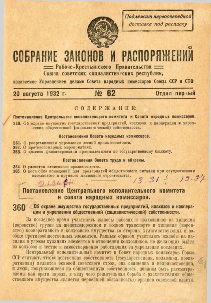 Закон, позже получивший народное название "закон о колосках" или "закон о пяти колосках" был принят 7 августа 1932 года, в сталинском уголовном кодексе это была так называемая 328-я статья. Ещё закон называли "семь восьмых" и "указ семь-восемь" — как нетрудно догадаться, из-за даты принятия закона. Есть свидетельства, что на принятии закона настаивал сам Сталин — великий мелиоратор и языковед открыто объявил уклонистов от его безумного плана по насильственной коллективизации врагами народа и государства.