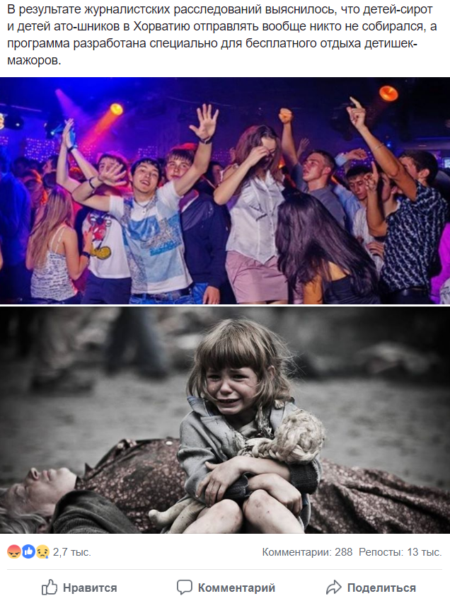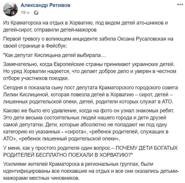 "Замечательно, когда европейские страны принимают украинских детей. Но правительство Хорватии надеется, что делает доброе дело и уверено в честном отборе участников поездки… Я показала сыну пост депутата Краматорского городского совета Лилии Кислициной, которая повезла детей в Хорватию - сирот, детей, лишенных родительской опеки, детей, родители которых служат в АТО. Каково же было его удивление, когда на фото он узнал знакомых ребят. Это дети весьма состоятельных людей нашего города и дети друзей самой депутатки. Дети, которые абсолютно не попадают ни под одну категорию из указанных - "сирота", "ребенок родителей, служащих в АТО", "ребенок, лишенный родительской опеки", - отметила она на своей странице в Facebook.