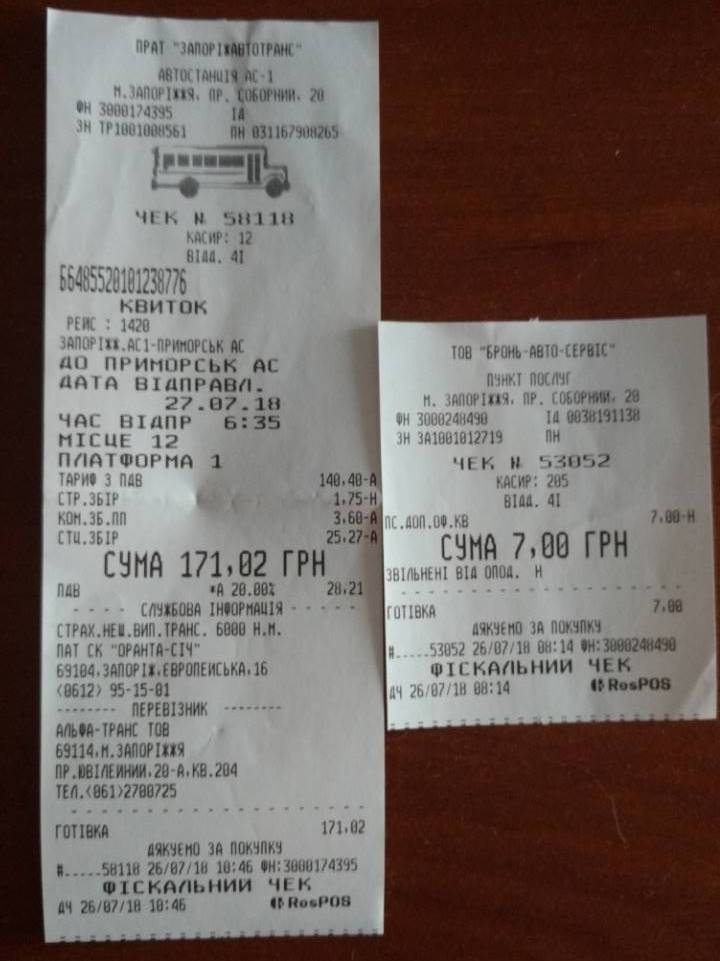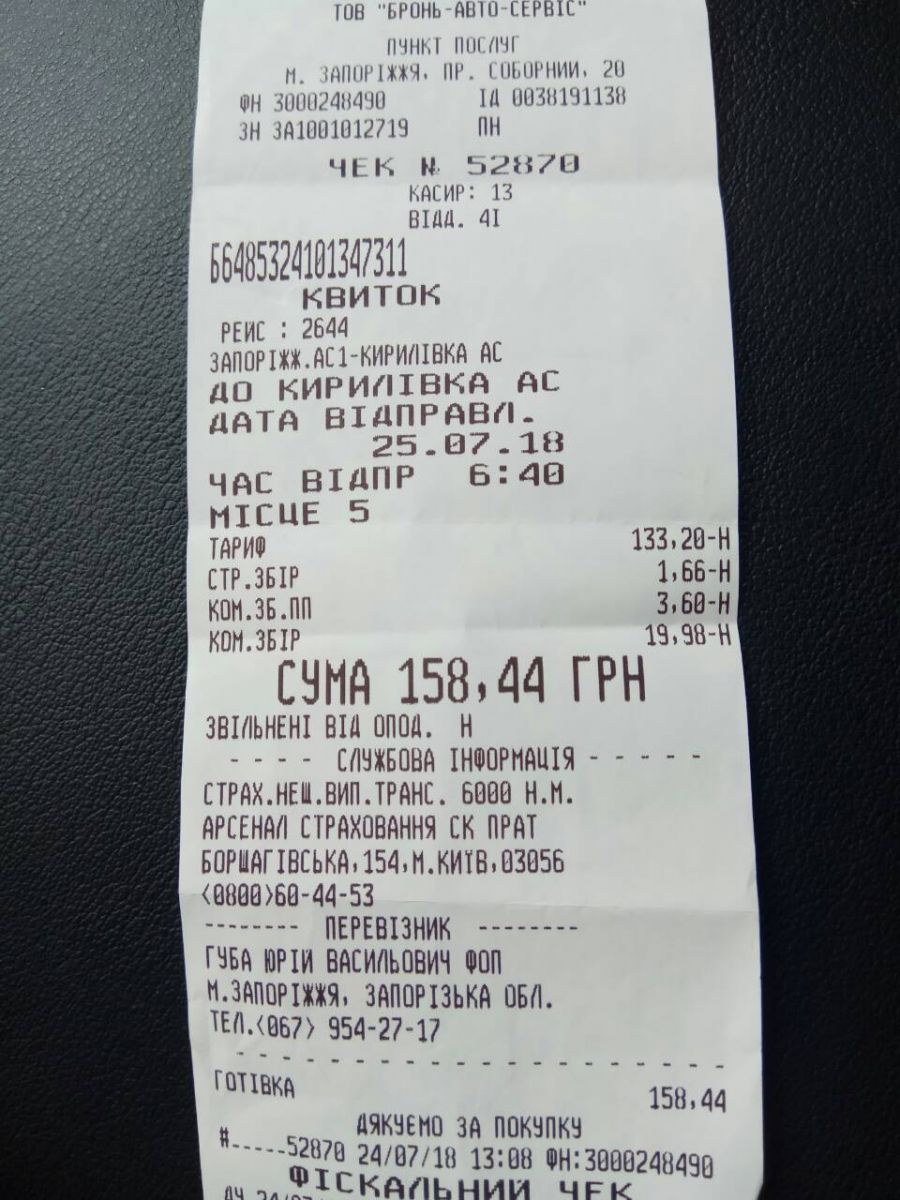 Если внимательно посмотреть на чек, он же билет, то можно номер «левого» рейса, можно увидеть в нем название перевозчика ФОП ГУБА, который вообще никогда не принимал участие в конкурсах или вот ФЛП Харитонов, та же ситуация. Далее самое печальное, Иванов очень любит рассказывать, что все его пассажиры застрахованы, да вот только он молчит о том, что застрахованы они всего навсего на 6000 грн., а не на 102000, как это положено по законодательству и это все видно из того же чека. Я тут ничего не выдумываю. Если фискалы посмотрят на этот чек внимательно, то в нем есть еще масса любопытных моментов, а если поднимут отчеты по кассе за пару лет, то поймут какой объем проходит только по кассе, а потом обналичивается через конверты, а еще плюс наличка на платформе.