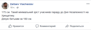 «175 см. Такий мінімальний зріст учасників параду до Дня Незалежності на Хрещатику. Дякую батькам за 180 см», — написал в соцсети депутат Запорожского горсовета, участник боевых действий Вячеслав Зайцев. И уточняет, что «Это парадная коробка 12 на 10. Там все должно быть идеально».