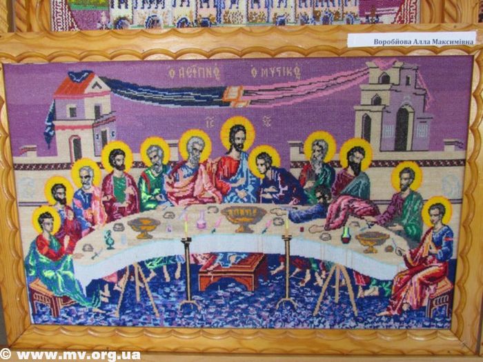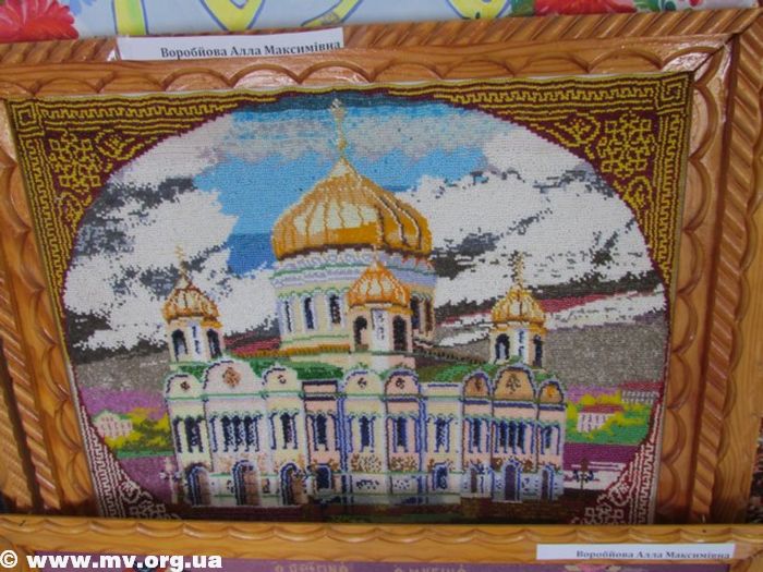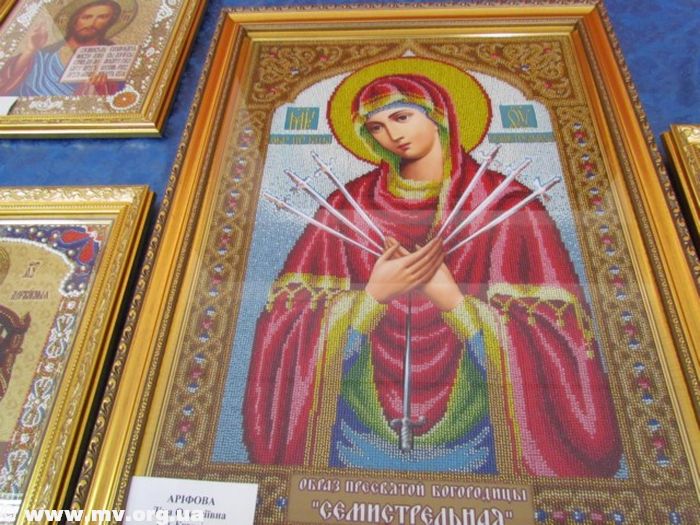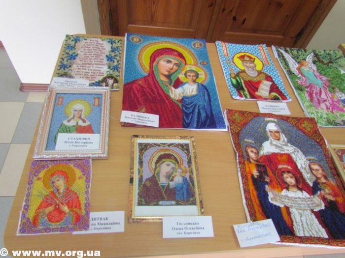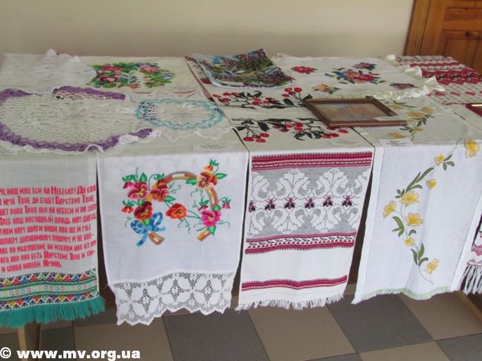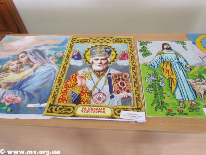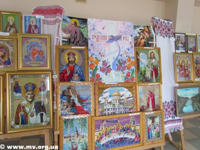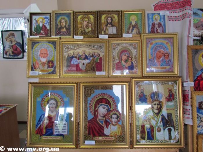 На выставке присутствующие любовались иконами святых, вышитыми крестиком и бисером, полотенцами, картинами на церковную тематику.