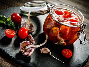 3. Первым делом добавить к помидорам чеснок, перемешать и выложить все в банку с плотной крышкой.