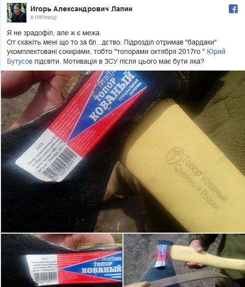 "Укроборонпром" купил эти топоры на территории Украины. У нас в Украине нет российских товаров? Та валом в любом магазине. Да, у нас есть постановление Кабмина с жестким требованием, не закупать ничего в России, но я вас уверяю, предприятие топоры из России не импортировало, это все закупается на территории Украины, а кто их уже ввез? Ну кто-то ввез", - резюмировал он.