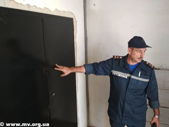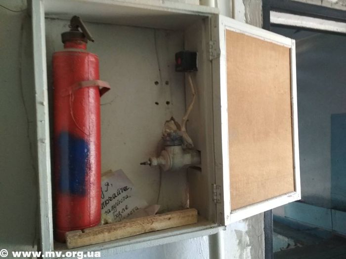 Также начальник Мелитопольского управления ГСЧС показал для примера один из пожарных щитов. Срок эксплуатации огнетушителя в нем истек в 1990-х гг., а рукав и вовсе отсутствует, равно как и повышающие давление насосы в подвале. Еще один щит оказался наполовину закрыт ролетной дверью – чтобы достать огнетушитель, придется потрудиться.