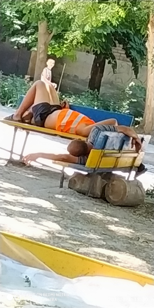 В рабочее время горе-работники спокойно отдыхают в тени на лавочке. Местные жители в недоумении, за что им платят деньги и когда же завершится такой долгожданный ремонт.