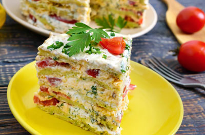 Яркий закусочный кабачковый торт с помидорами и сыром