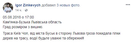 "05.08.2018 в 17:00 Каменка-Бугская, Львовская область. Град размером с вишню. Трасса Киев - Чоп, от города Буск в сторону Львова, гроза поскидала ветви деревьев на трассу, водители будьте внимательны и осторожны!", - говорится в сообщении.
