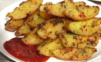 Кусочки свежей зелени, чеснок, ароматная паприка сделают и без того вкусные запеченные в духовке дольки такими восхитительно притягательными.