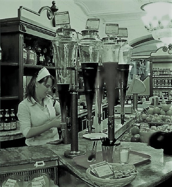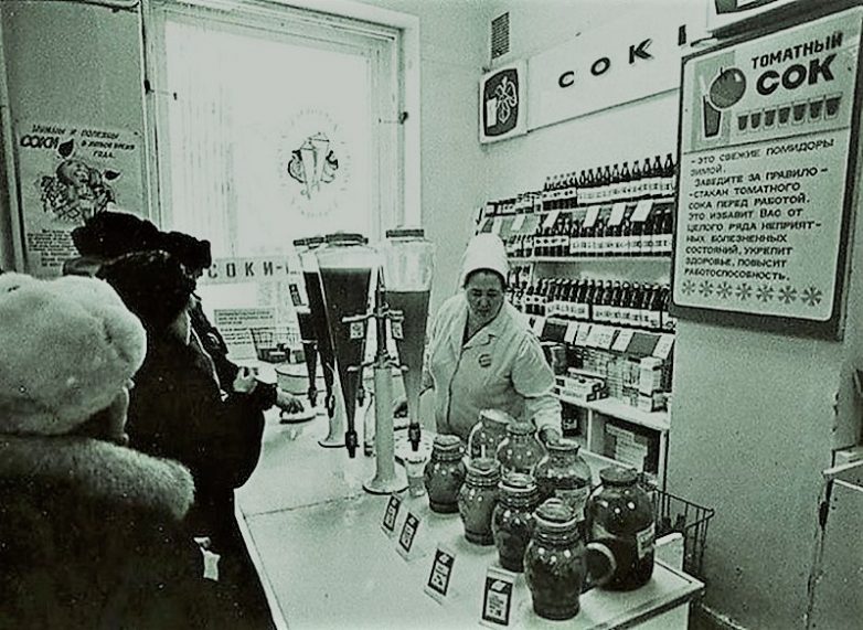 В овощных отделах гастрономов раньше стояли огромные, на три-четыре литра, колбы с разноцветными соками. Внизу у этих конусов были бронзовые краники с «ушками» - через них сок попадал в стаканы. Гранчак яблочного сока стоил 12 копеек, томатный был по 10, а березовый самый дешевый - всего 9 коп. Самыми дорогими были гранатовый и виноградный соки - 20 коп. за стакан. Рядом с колбами обязательно находилась емкость с солью - чтобы можно было ложечкой (взятой из стакана с водой) добавить в свой стакан томатного сока и размешать.