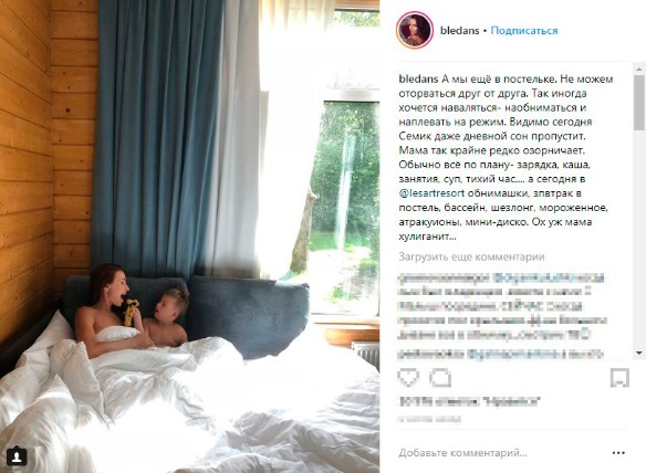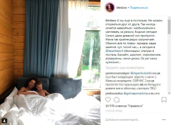 Однако в этот раз Бледанс позволила себе и сыну отойти от правил. "Сегодня обнимашки, зпвтрак в постель, бассейн, шезлонг, мороженное, атракуионы, мини-диско (здесь и далее орфография и пунктуация авторов сохранены. – Прим. ред.). Ох уж мама хулиганит..." – завершила свой пост актриса.