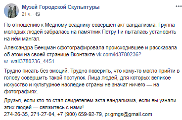 "По отношению к Медному всаднику совершен акт вандализма. Группа молодых людей забралась на памятник Петру I и, по словам очевидцев, пыталась установить на нем мангал... Трудно поверить, что кому-то могло прийти в голову совершить такой поступок", - говорится в сообщении музея в соцсетях, которое сопровождается фотографиями, сделанными очевидцами происшествия.