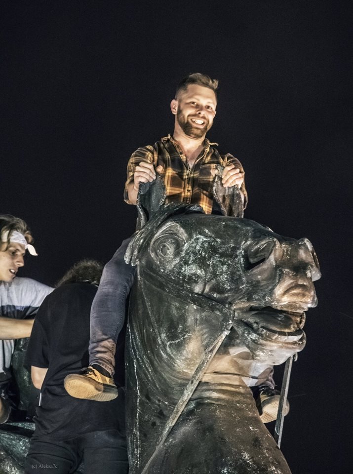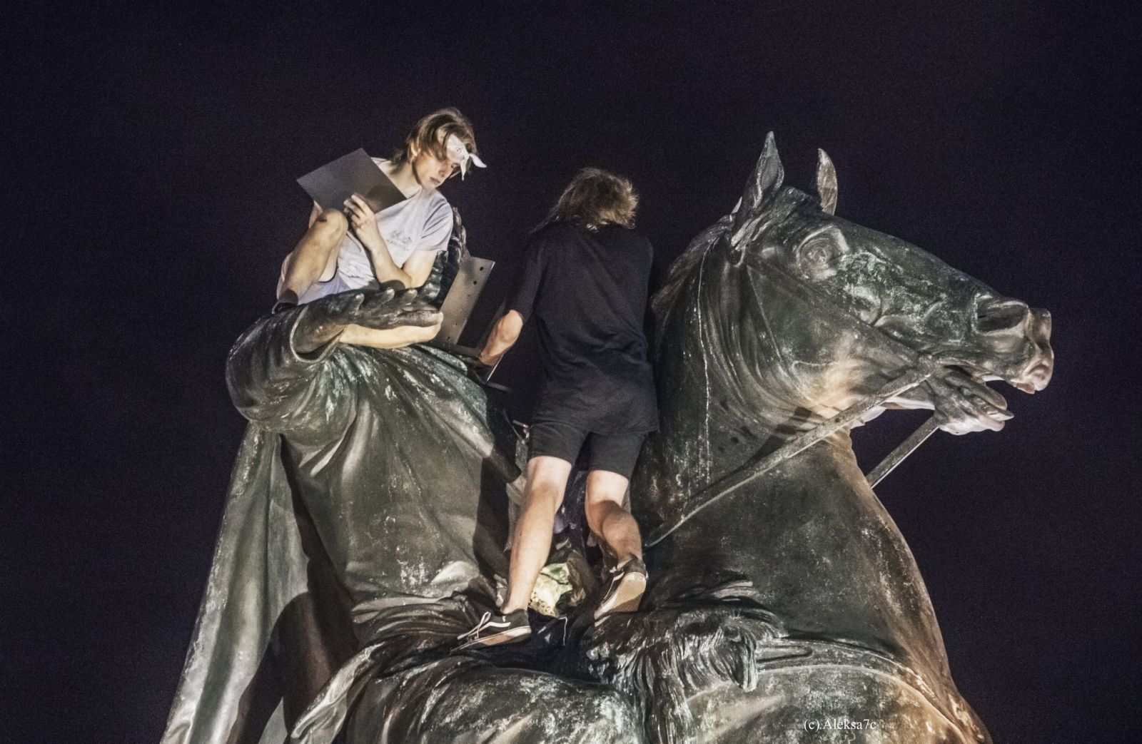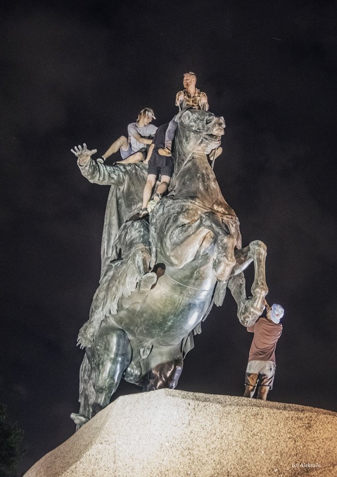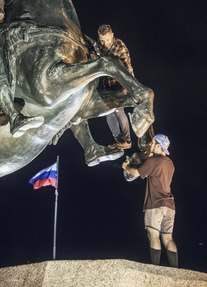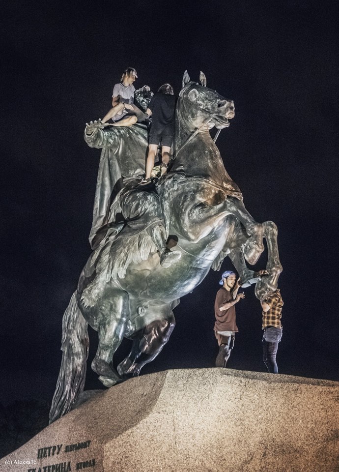 "5 августа 2018 года в полицию в Адмиралтейском районе Петербурга поступило сообщение о том, что на скульптуру Медный всадник забрались двое молодых людей. Прибывшими на место сотрудниками полиции задержаны двое мужчин в возрасте 20 и 32 лет, которые были доставлены в отделение полиции", - сообщает пресс-служба ГУ МВД по Петербургу и Ленобласти.