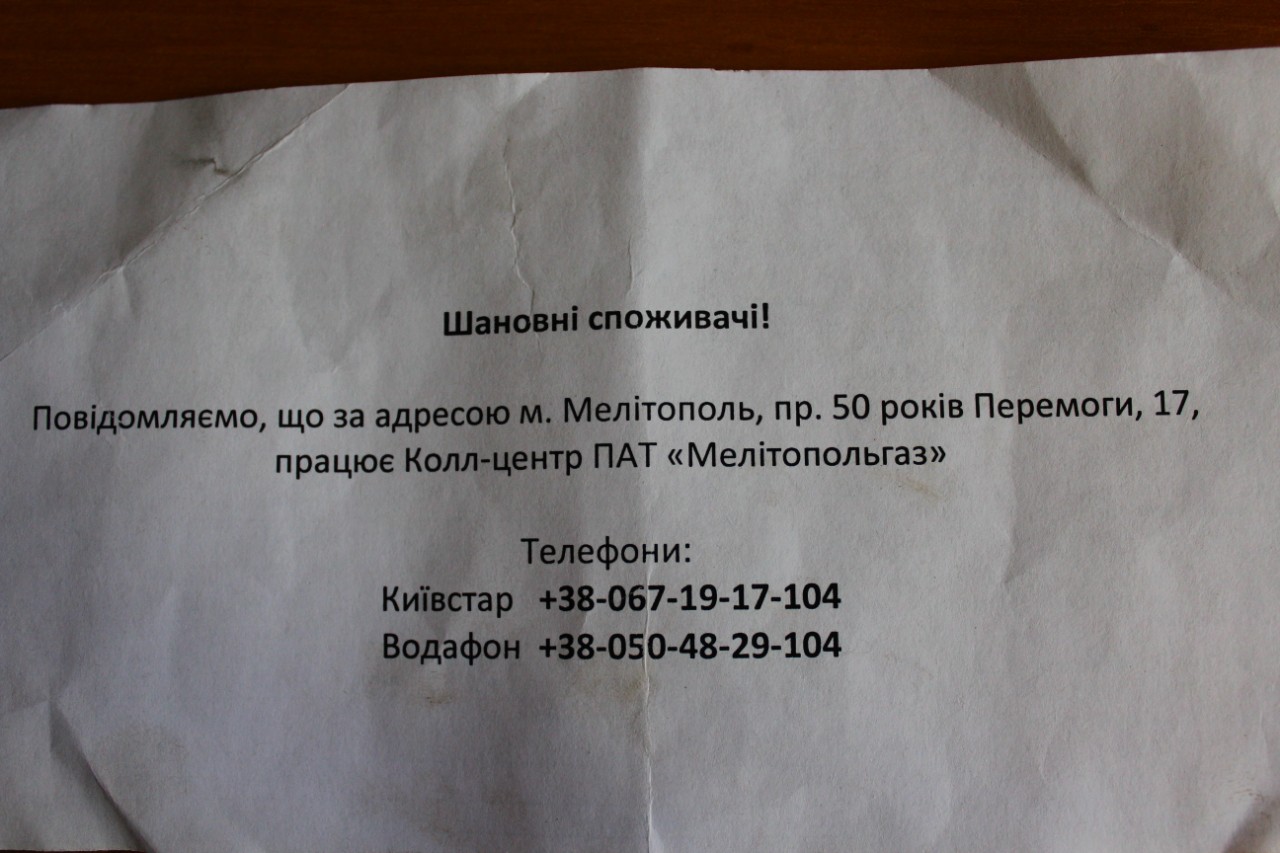 У ПАО «Мелитопольгаз» появился колл-центр, об этом предприятие разместило информацию на своих квитанциях.