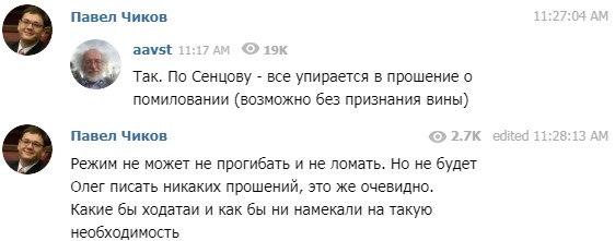 "Режим не может не прогибать и не ломать. Но не будет Олег писать никаких прошений, это же очевидно. Какие бы ходатаи и как бы ни намекали на такую необходимость", - написал Чиков.