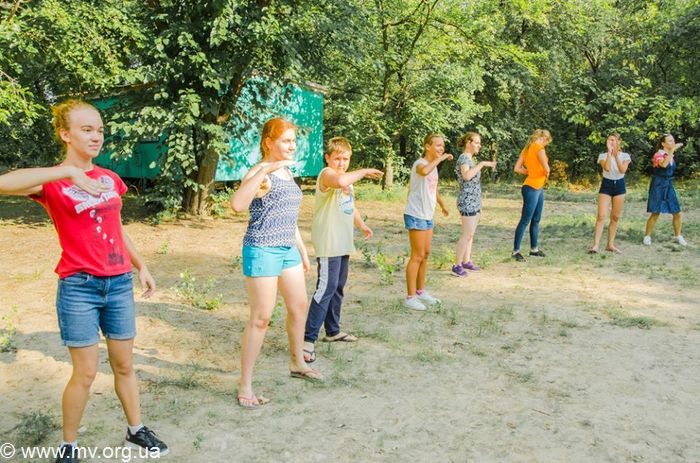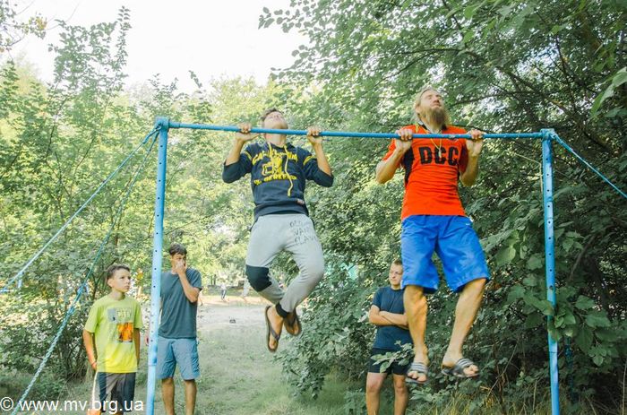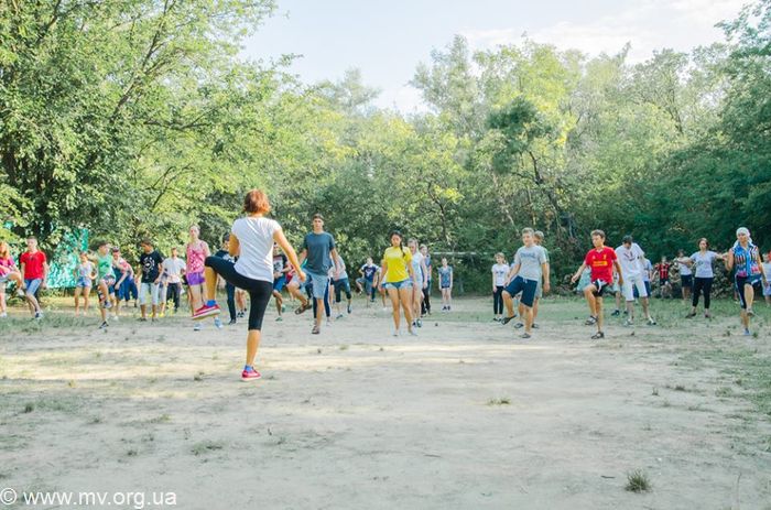 Утро в проекте открывала зарядка. После разминки островитяне выбирали, что каждому по душе. Парни – тяжелую зарядку (турники и силовая разминка под руководством батюшек). Девчонки – веселую зарядку.