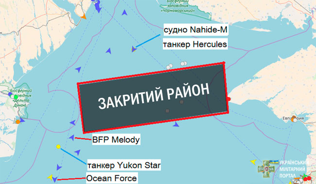 Кроме того, российские военные заставили изменить курс гражданские суда Ocean Force и BFP Melody.